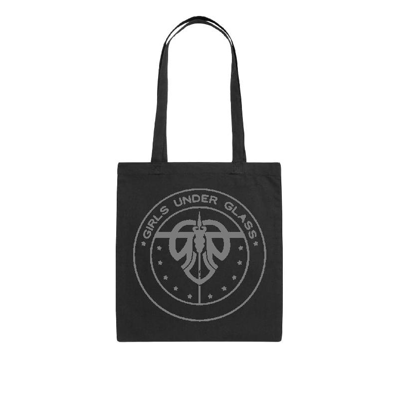 Baumwollbeutel - Logo silber schwarzer Beutel mit silberfarbenen Logo GIRLS UNDER GLASS auf der Vorderseite