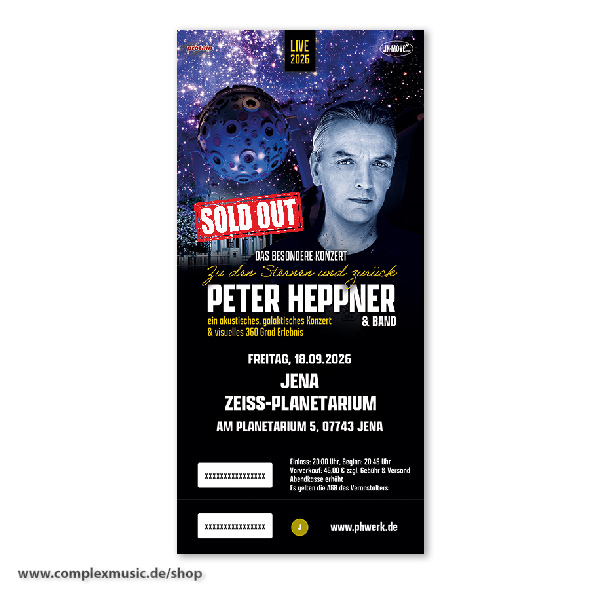 Original-Ticket "Heppner Akustik, Jena/Planetarium" - AUSVERKAUFT! ein akustisches, galaktisches Konzert & visuelles 360 Grad Erlebnis Freitag, 18.09.2026 Jena / Zeiss-Planetarium Am Planetarium 5 07743 Jena inkl. VVK-Gebühr und gesetzlicher Mehrwertsteuer örtlicher Veranstalter: In Move GmbH Tourveranstalter: Protain Concerts Einlass: 20:00 Uhr Beginn: 20:45 Uhr